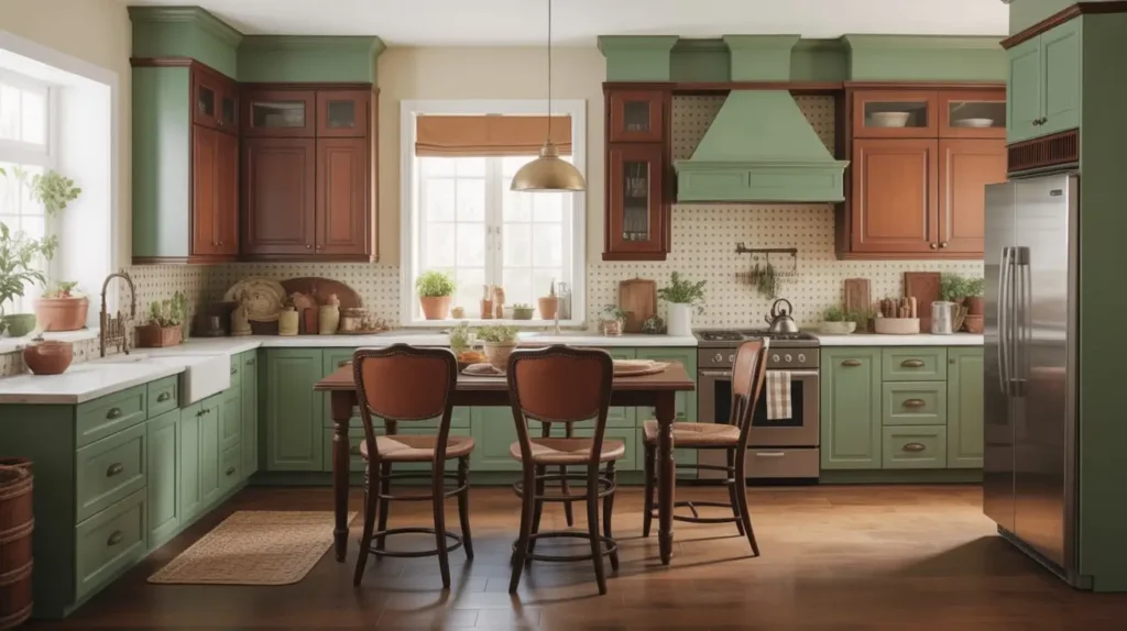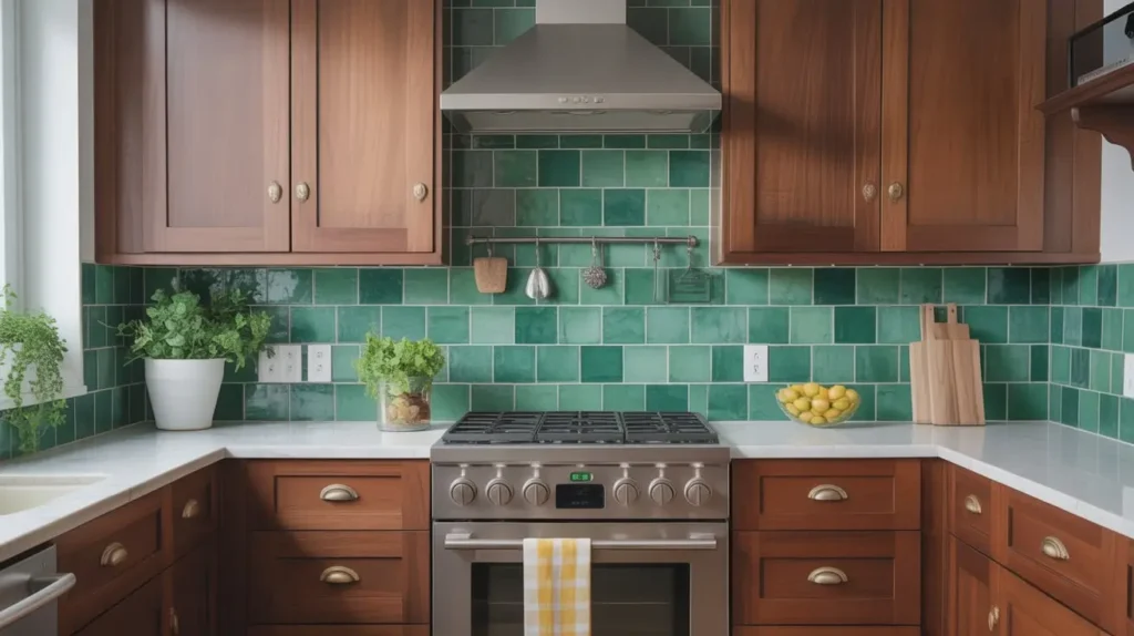 Let’s focus on the backsplash as the primary green element. Keep the cabinets a beautiful, natural brown wood (walnut or stained oak) and bring the green in through the tile work.