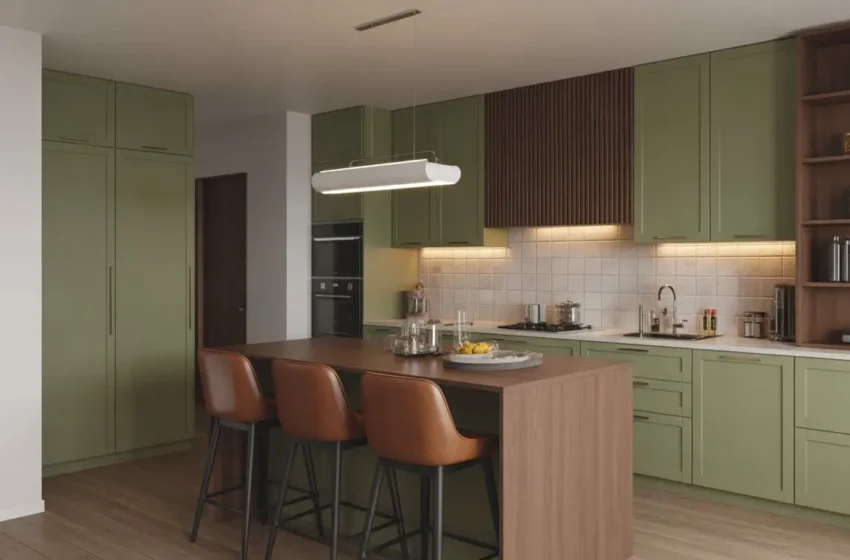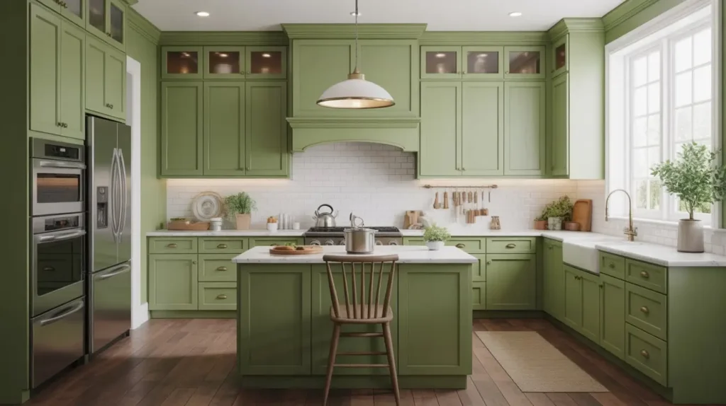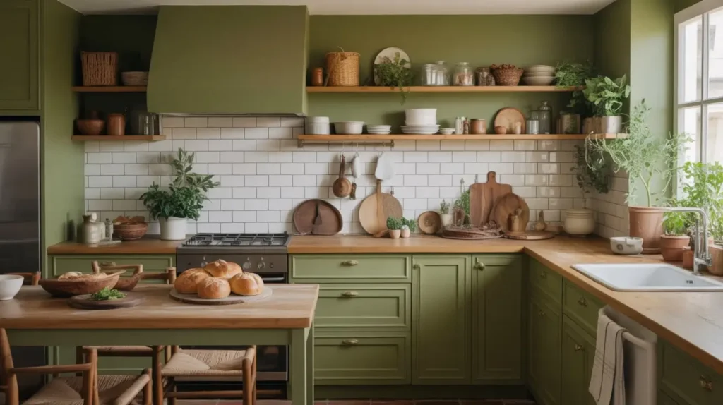 Olive green brings a savory, Mediterranean vibe to the kitchen. It’s deeper than sage but not as demanding as emerald. When you mix this with natural, unfinished-looking wood shelving, you achieve a rustic, “I bake bread from scratch” aesthetic. Even if you actually just buy your bread at the store.