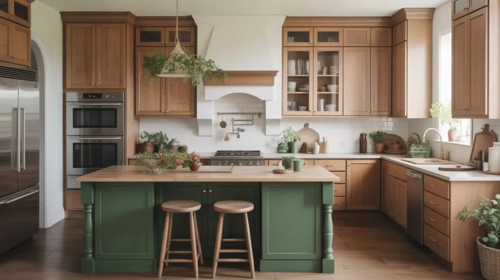 Maybe you aren’t ready to paint your entire kitchen green. That’s fine. We can compromise. Paint the island a deep forest green and keep the perimeter cabinets a natural brown oak. This is often called the “tuxedo” look, but we are making it woodsy and approachable rather than stark black and white.