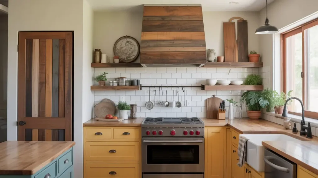 Reclaimed wood has nail holes, knots, and uneven grain. When you pair this rough material with smooth, freshly painted green cabinets, the contrast is electric. It stops the new cabinets from feeling “too new.”