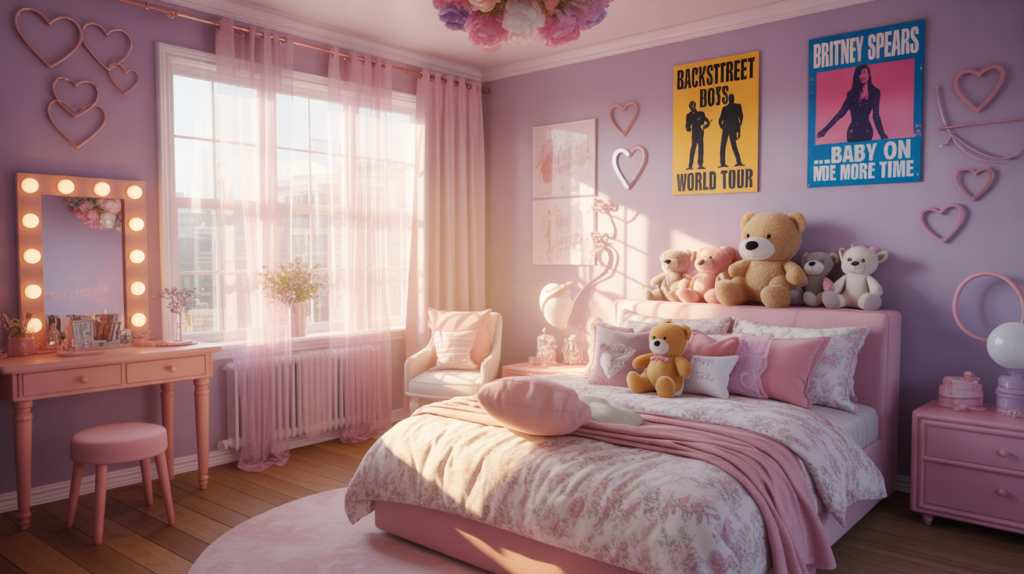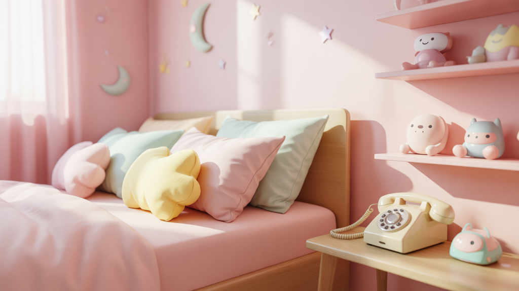 The color scheme here is lavender, mint green, baby pink, and soft peach. Everything should feel light, airy, and just slightly magical. The 90s loved mixing kawaii culture with Western aesthetics, and this bedroom style is the perfect marriage of both.
