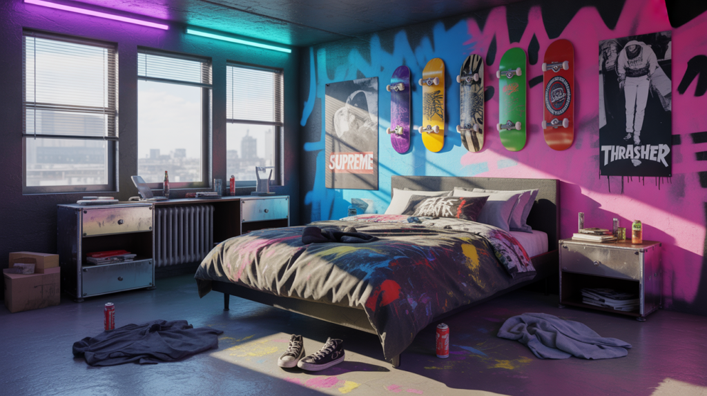 Black, gray, red, and white dominate the color scheme, often with graffiti-style accents. The vibe is urban, edgy, and completely unconcerned with traditional decorating rules.