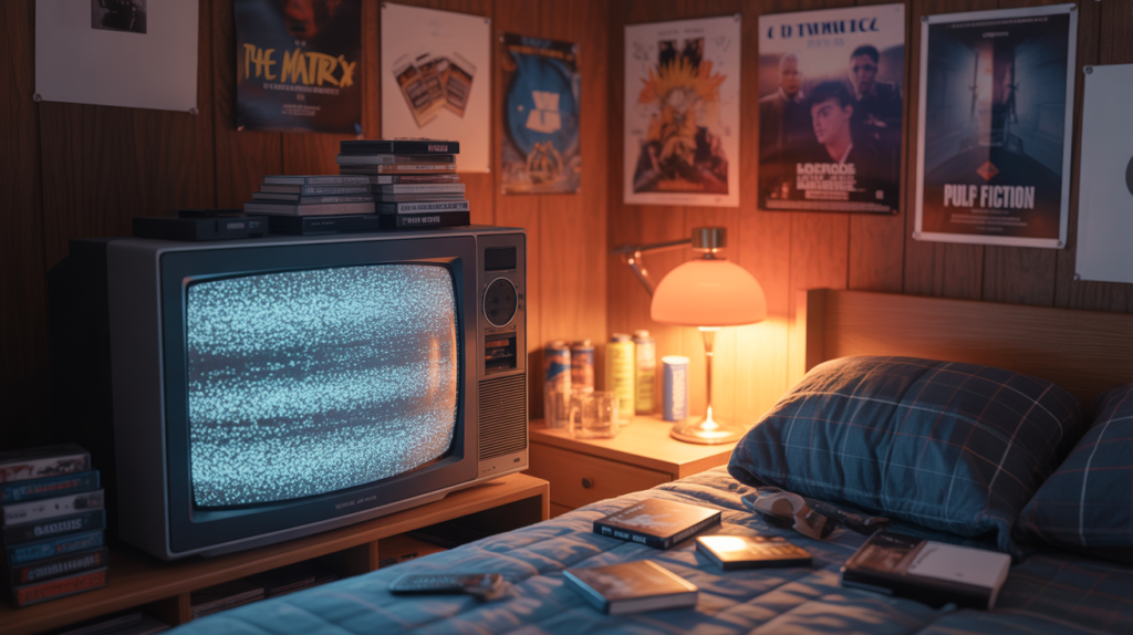 Let’s end with the most nostalgic aesthetic of all—the VHS-inspired bedroom that celebrates our analog past. This aesthetic is meta, referencing the very medium through which we consumed so much 90s culture: videotapes.