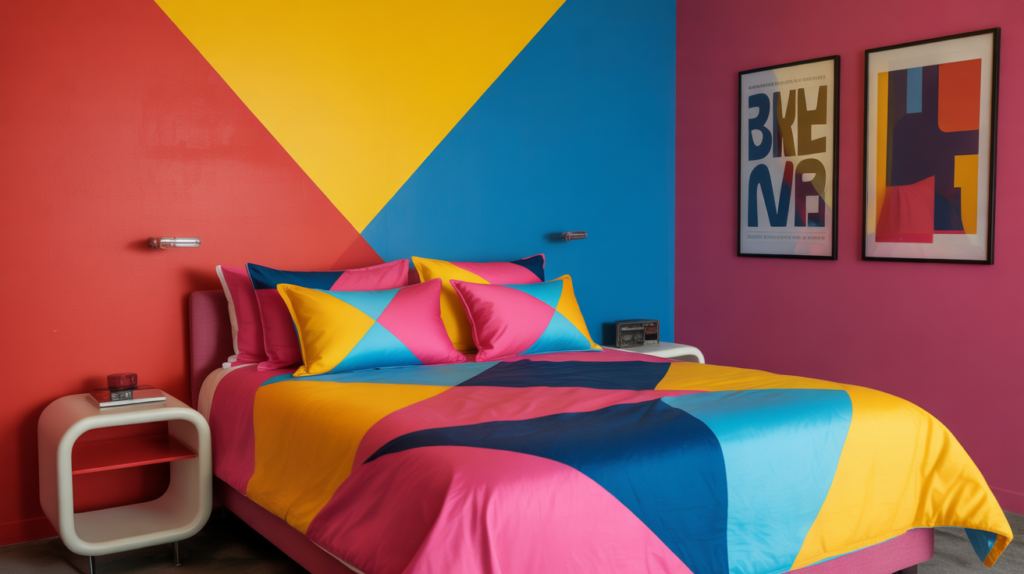 Bold, geometric, and unapologetically bright—color blocking was THE design trend of the 90s, and it translated beautifully into bedroom aesthetics. This style takes inspiration from Memphis design and makes your room feel like a piece of modern art.