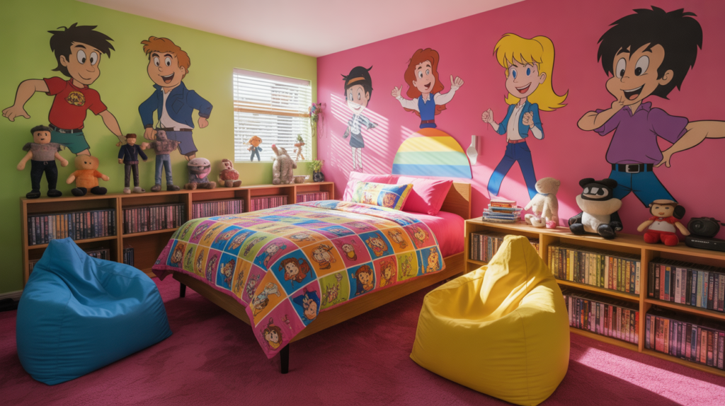 The color palette here is all over the place, and that’s intentional. Primary colors mix with secondaries, creating that animation cel vibe. Your room should feel like you stepped into a cartoon itself.