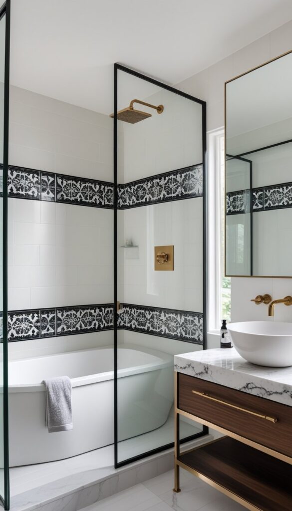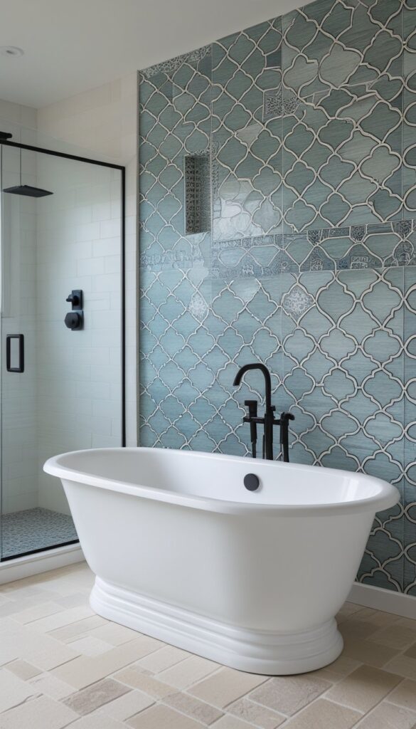 Patterned tiles make the bathtub area instantly eye-catching and unique. Whether using Moroccan, geometric, or floral designs, patterned tiles bring artistry to the bathroom. They work especially well as a feature wall behind a freestanding tub. Keeping other elements simple ensures the tiles remain the star of the space.