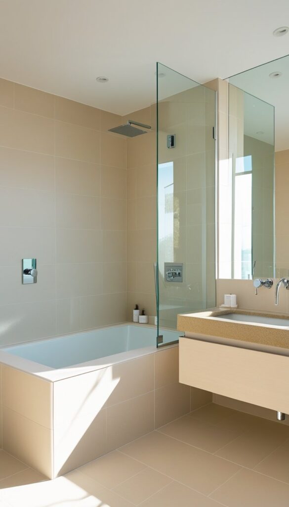 Neutral-toned tiles around the bathtub provide warmth and balance, creating a calm and inviting atmosphere. Beige, taupe, and sandy hues are especially versatile, blending seamlessly with different bathroom styles. This palette keeps the design grounded while allowing accents like fixtures or mirrors to shine.