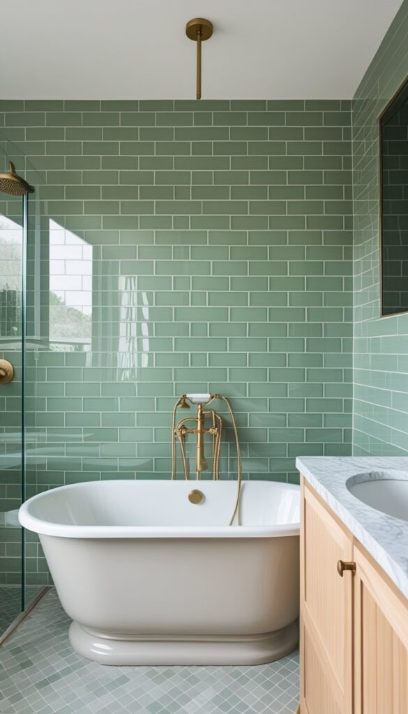 Green tiles bring an earthy and refreshing touch to the bathtub space. From sage to emerald, green shades add vibrancy and a connection to nature. They pair beautifully with wood accents and brass fixtures for a modern organic style. The calming tones make the bathtub area feel serene and inviting.