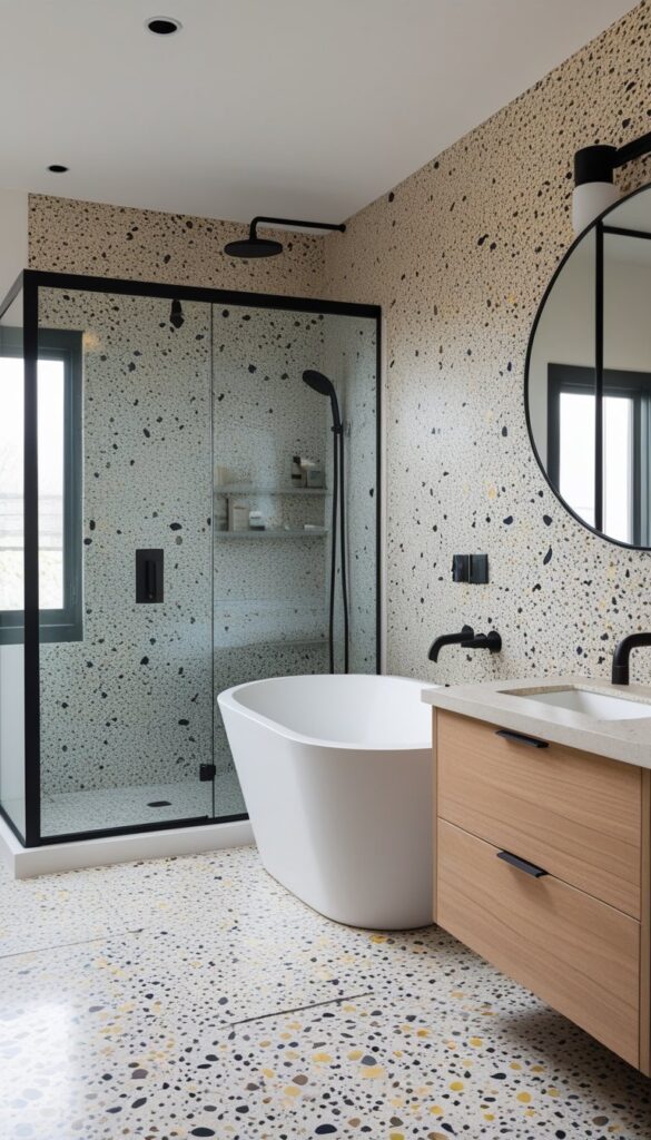 Terrazzo tiles bring texture and charm with their speckled design, making the bathtub area feel lively and artistic. They’re durable and work well for both walls and floors, offering a mix of colors in one finish. Terrazzo pairs beautifully with minimalist tubs and sleek fixtures. This design is especially popular in contemporary homes.