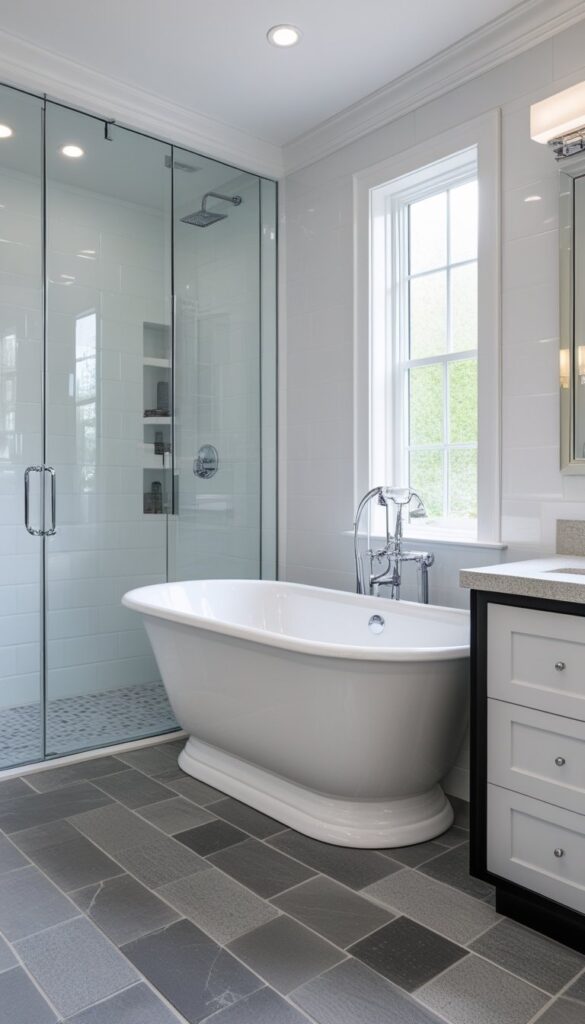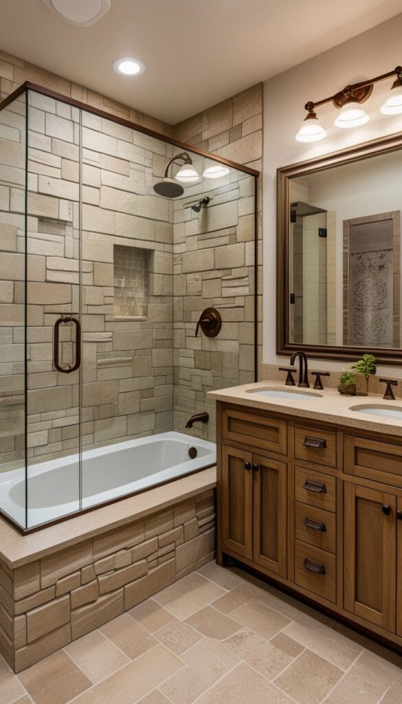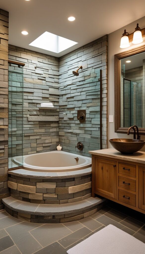 Natural stone tiles around the bathtub create a rustic yet elegant feel. The raw textures and organic patterns connect the bathroom to nature, making it feel warm and inviting. This choice works well in farmhouse or spa-inspired bathrooms. Stone tiles also pair beautifully with wood and neutral finishes.