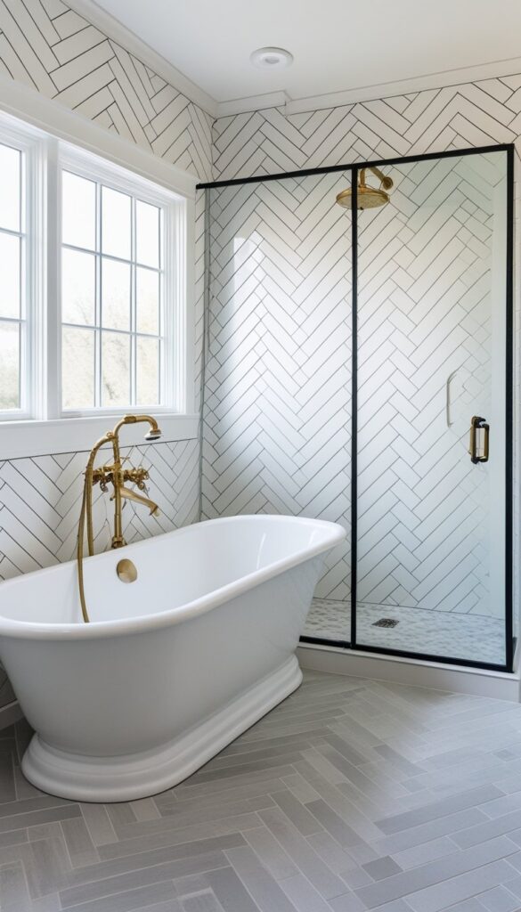 Herringbone tiles add a touch of elegance and visual movement around the tub area. Their angled pattern draws the eye and makes the space feel more dynamic. This design works especially well in neutral shades like white, gray, or beige. Paired with a simple freestanding tub, it creates a timeless yet modern look.