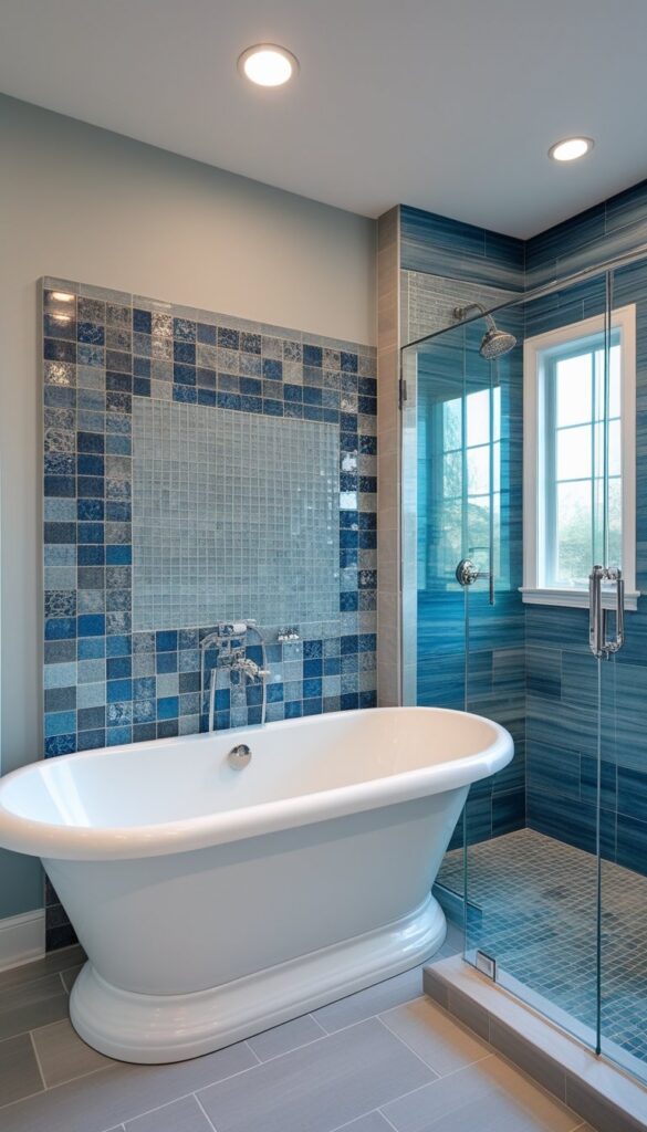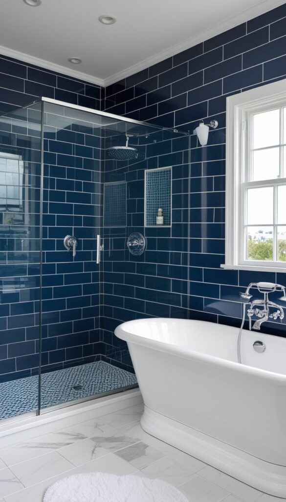 Blue tiles around the bathtub create a calming and refreshing atmosphere, reminiscent of water and coastal retreats. Shades like navy, teal, or aqua can all work depending on the mood you want. Blue tiles pair beautifully with white tubs and light flooring for a serene spa-like design. This choice feels both stylish and tranquil.