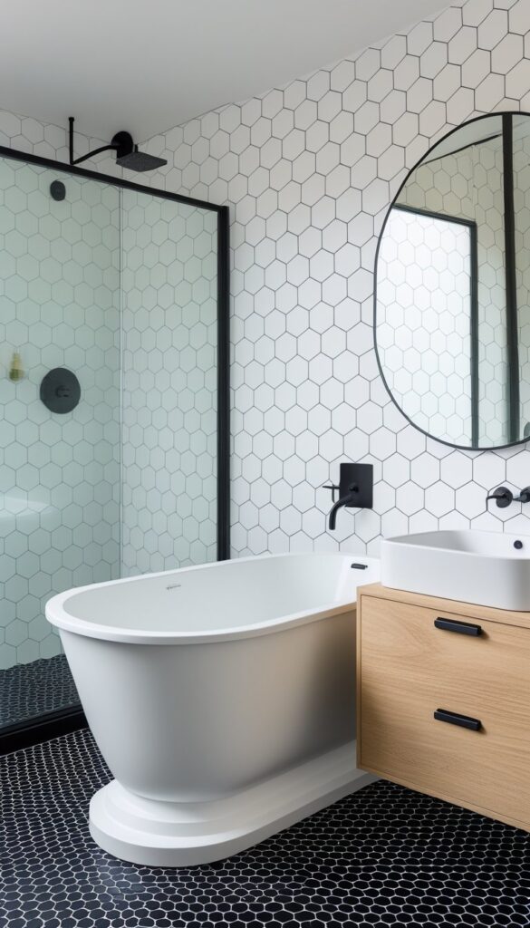 Hexagon tiles bring geometric style to the bathtub area, adding interest without overwhelming the space. Their honeycomb pattern looks playful yet refined and works well in both small and large bathrooms. A monochrome palette can make the look modern, while colorful hex tiles bring vibrancy. Paired with a simple tub, the pattern stands out beautifully.