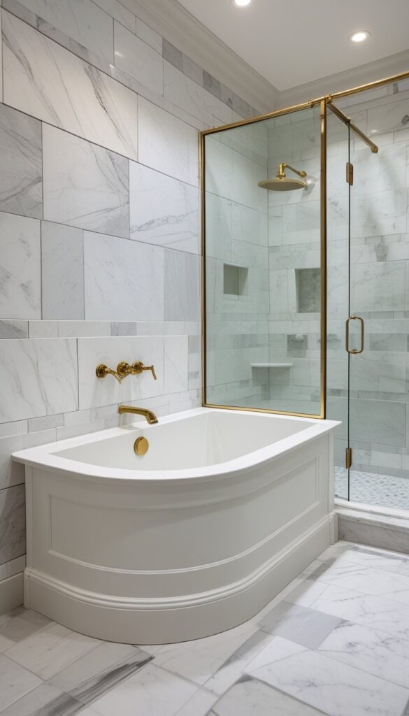 Marble tiles instantly bring luxury to the bathtub area, adding depth and natural veining that feels timeless. They can be used as a tub surround or extend to the walls for a seamless spa-like look. The soft texture of marble pairs beautifully with warm lighting. A freestanding or built-in tub works equally well with this elegant choice.