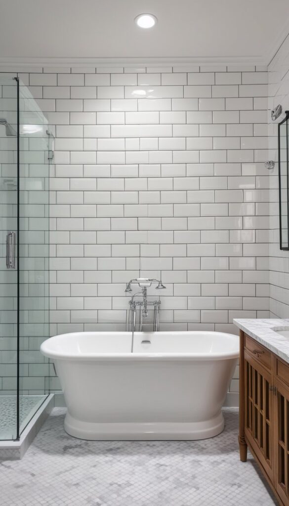 White subway tiles around the bathtub create a clean, timeless look that never goes out of style. Their linear pattern keeps the design simple, while grout color can be used to add subtle contrast. This choice works beautifully in both modern and traditional bathrooms. Pairing it with a freestanding tub ensures the tiles remain the highlight without overwhelming the space.