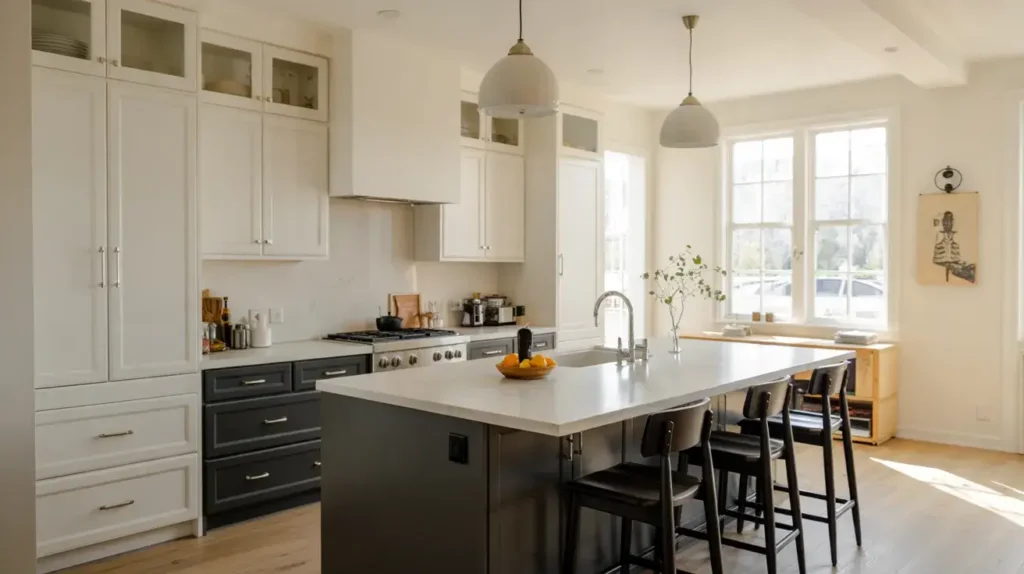 Why does this work so beautifully? The heavier visual weight of darker cabinets naturally grounds the space when placed at the base. Meanwhile, white upper cabinets keep the room feeling open and prevent that “cave” effect that sometimes happens with too much dark cabinetry.