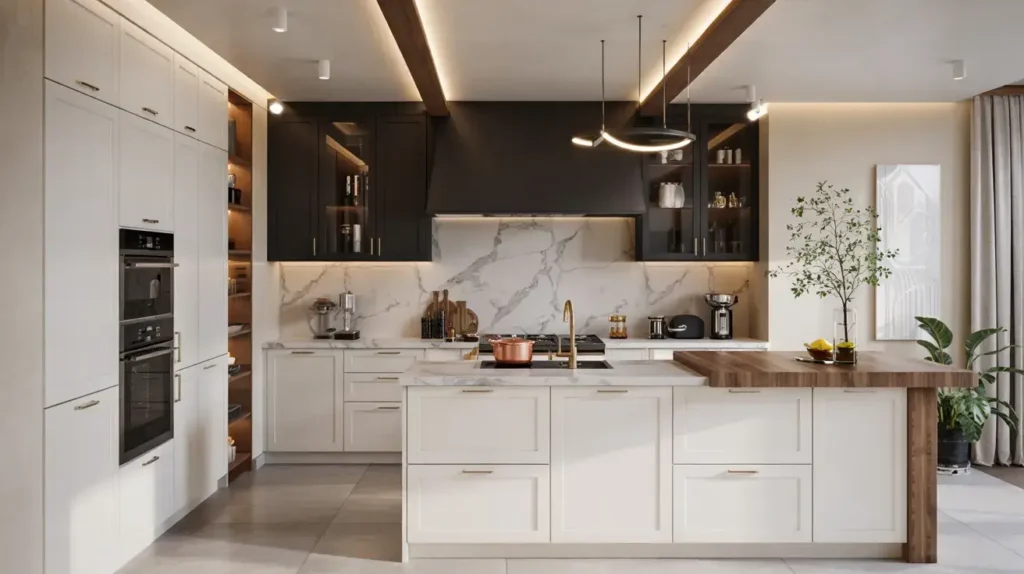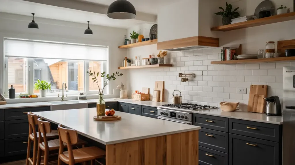 I’m personally obsessed with kitchens featuring black and white cabinets paired with open oak shelving. The combination feels effortlessly stylish—modern enough for contemporary homes yet warm enough for traditional ones.