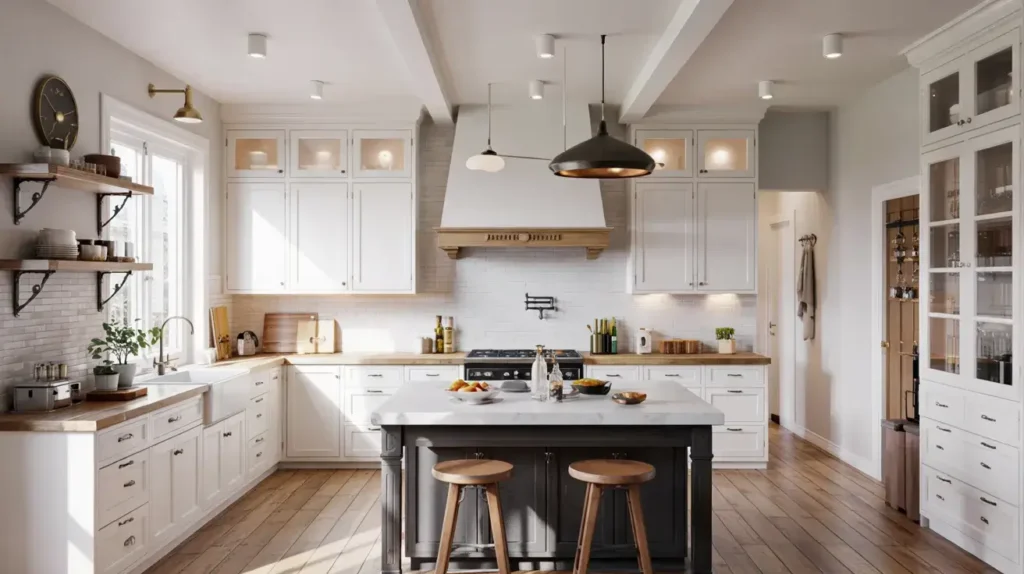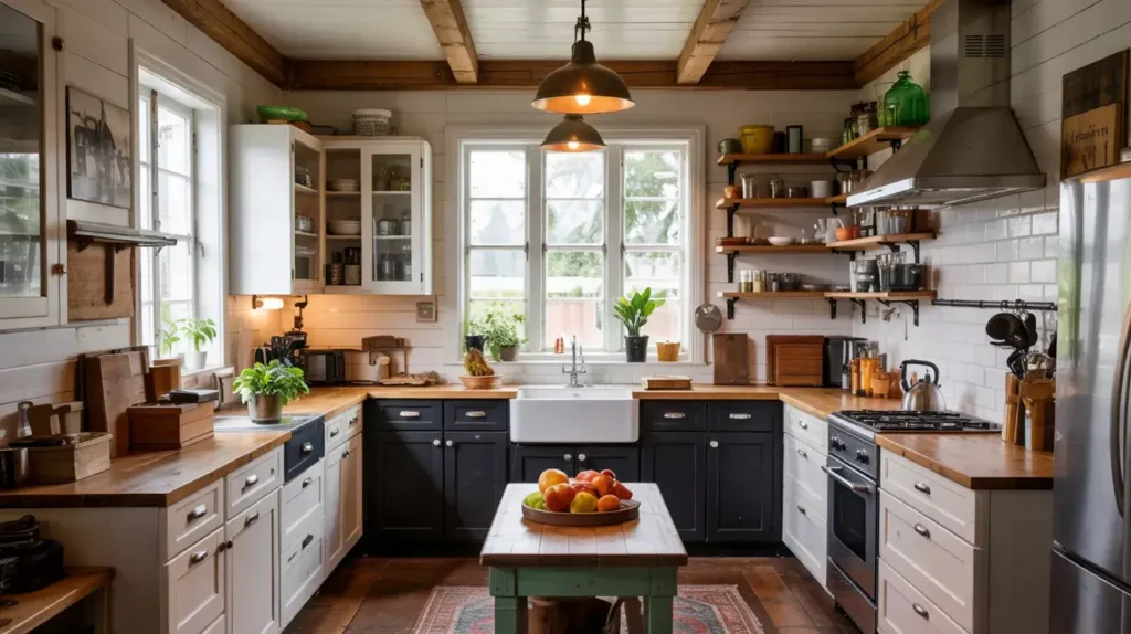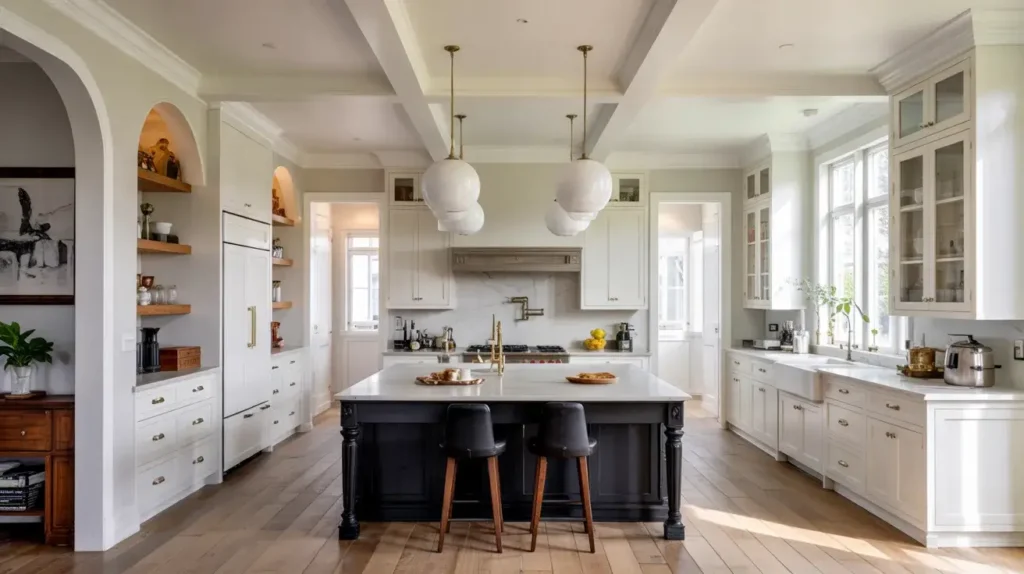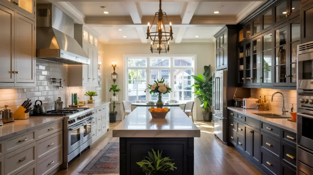 - Neutral transitional elements like stainless appliances or gray countertops