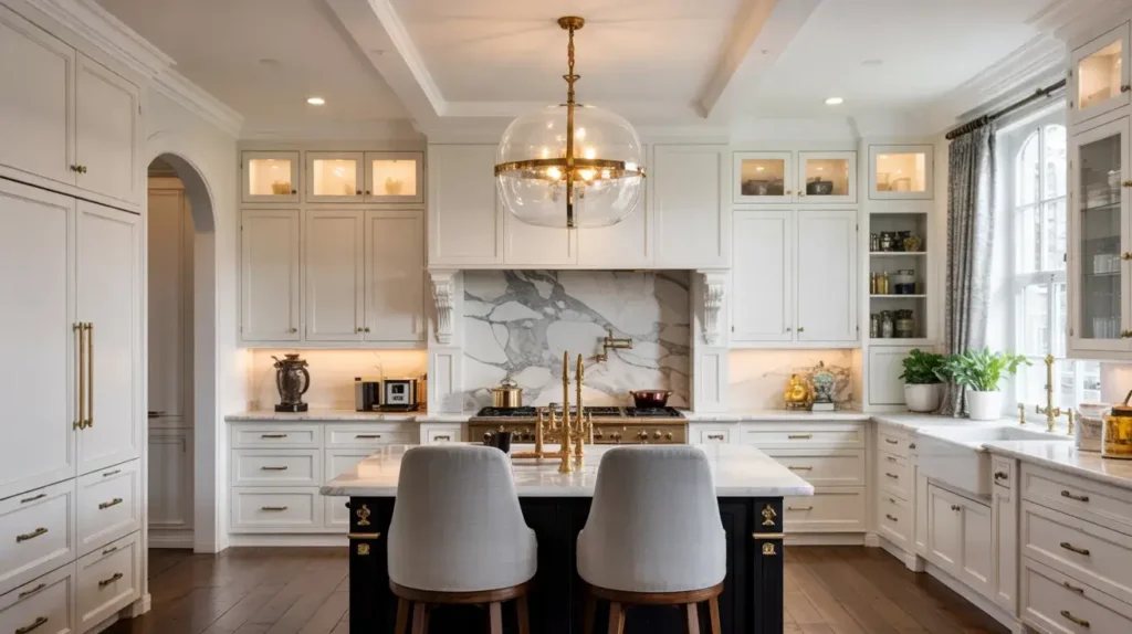 This approach works brilliantly because islands naturally serve as the kitchen’s centerpiece anyway. Why not dress them appropriately? The black island commands attention while white cabinets keep everything else bright and airy.