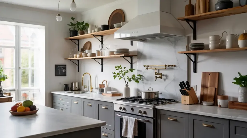 Hybrid approach: Replace only some upper cabinets with open shelving. Keep frequently used items behind closed doors and reserve open shelves for attractive display pieces.