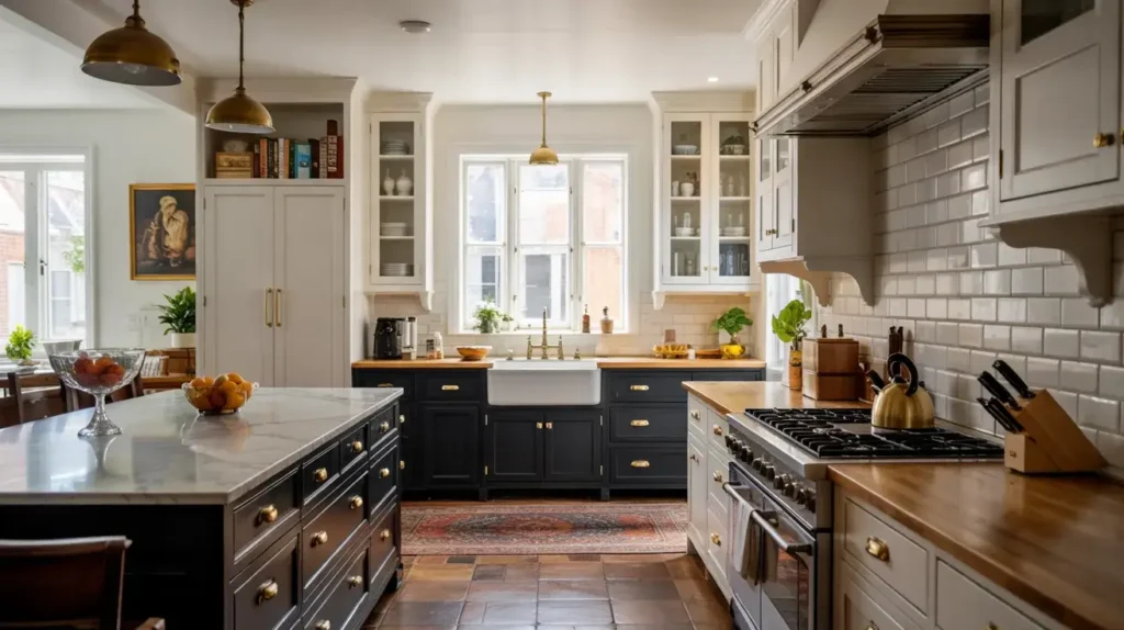 My friend recently went this route in her 1990s colonial kitchen renovation. She kept all perimeter cabinets white to maintain the home’s traditional feel but added a black shaker-style island that brought instant modernity. The transformation cost less than you’d expect because she only painted one element black rather than half her cabinets.
