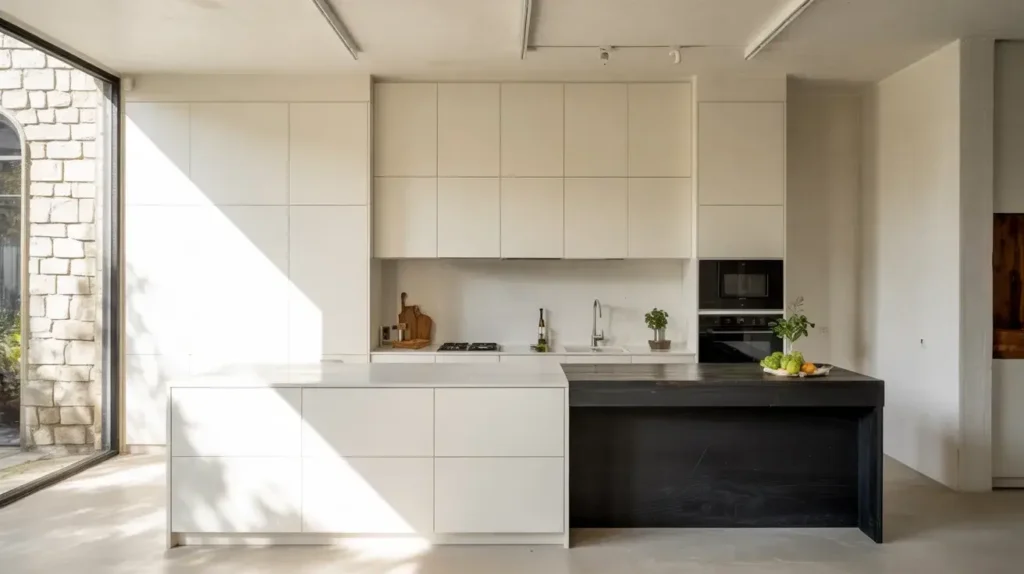 Minimalism and black-and-white palettes share the same DNA—both celebrate restraint, intentionality, and letting quality speak louder than quantity. Flat panel cabinets in black and white create the ultimate minimalist kitchen where clean lines reign supreme.