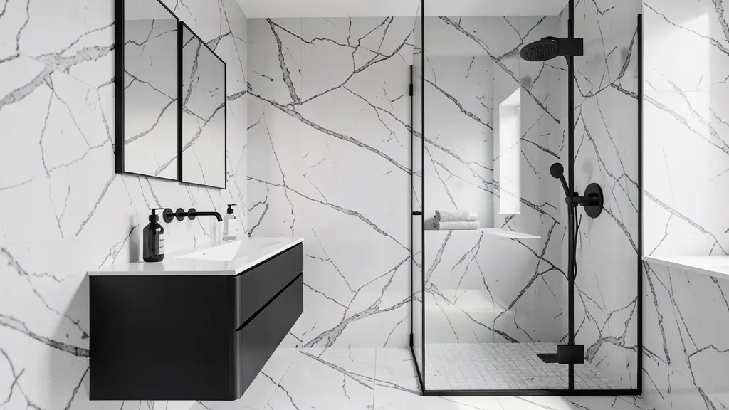 The secret to making a compact bathroom feel luxurious is strategic material placement and smart design choices. Black and white marble can actually make a small space feel larger when you use it correctly. Light-colored marble with minimal veining on the walls creates an expansive feel, while darker marble accents add depth without closing in the space.