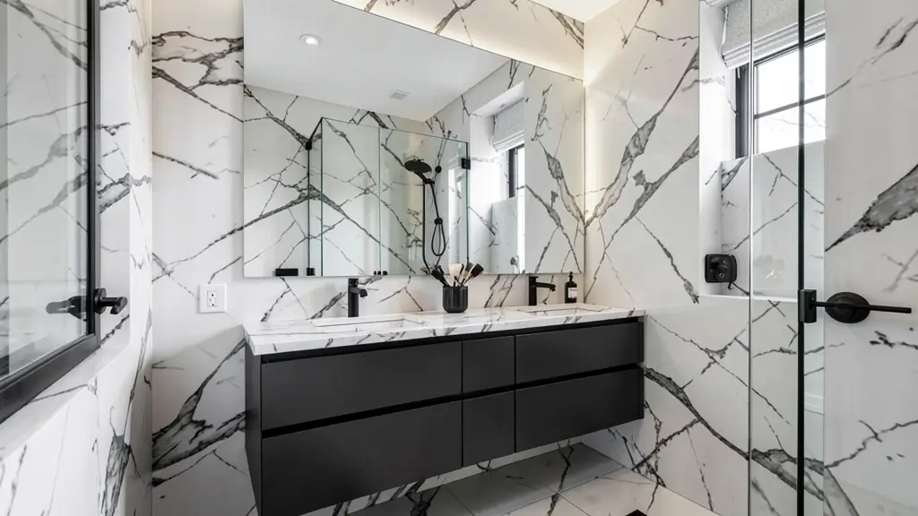13. Black and White Marble Bathroom with Large Slab Walls