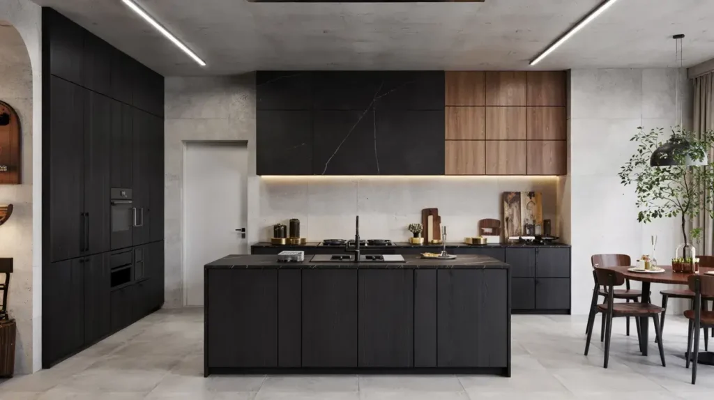 Finish strong! Contemporary kitchens thrive on sleekness. Combine glossy or matte black cabinets with wood elements (counters, shelves), then add integrated lighting — under‑cabinet LEDs, recessed lights, or pendant lights over the island. The light highlights the black and wood beautifully, creating depth and ambience.