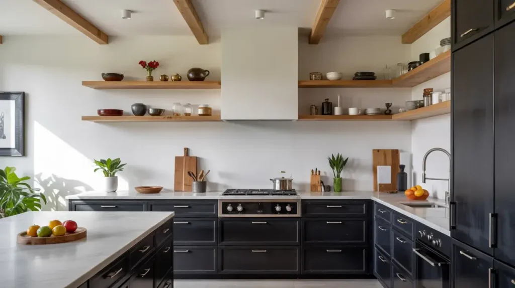 4. Black Shaker Cabinets with Natural Wood Open Shelves