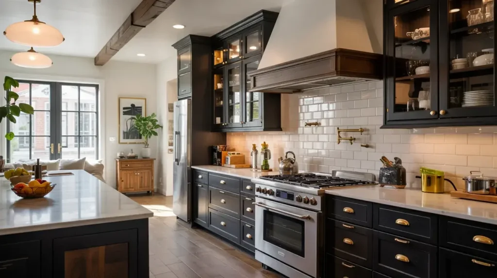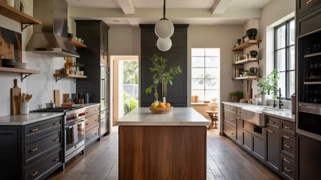 “Warm black” isn’t an oxymoron! Some black paints have subtle brown or espresso undertones. Use warm black cabinets throughout, then add a rich walnut wood island. The island becomes a stunning focal point that ties the warm black to the wood.