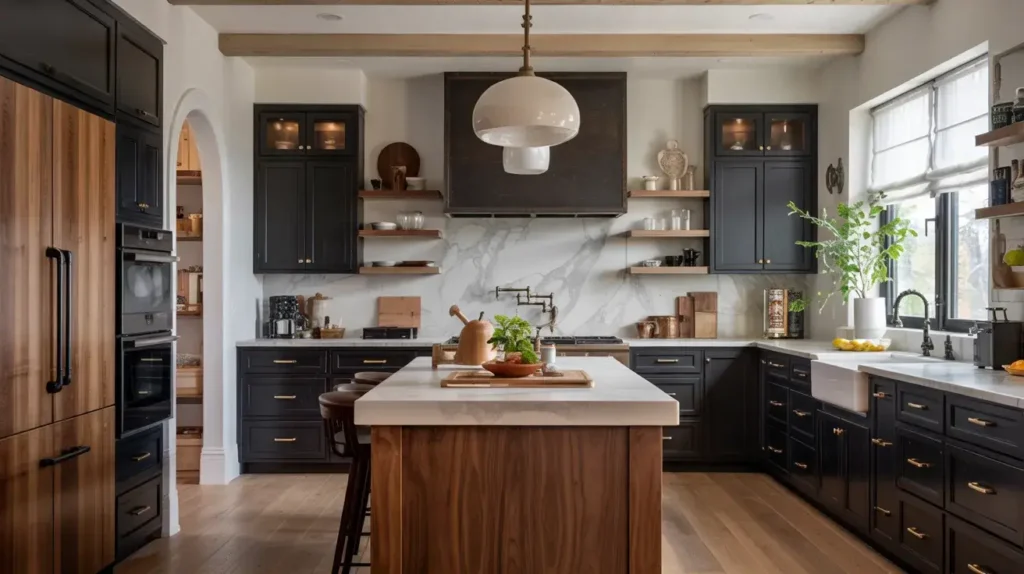Two‑tone cabinets are trending, and black + wood is the ultimate pairing. Example: lower cabinets in walnut woodupper cabinets in matte black, topped with marble countertops. The marble ties the two tones together with its veining.