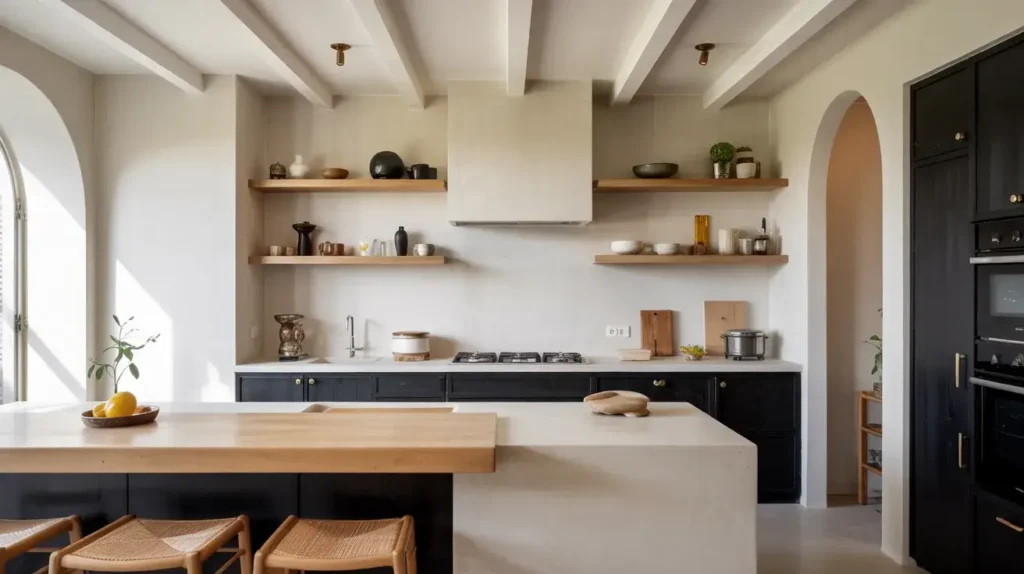 Minimalism isn’t just “owning three plates.” In kitchens, it means clean lines, zero clutter, and intentional choices. For this look, use sleek black cabinets with natural wood countertops (birch or maple). No handles? Even better — handle‑less cabinets scream modern.