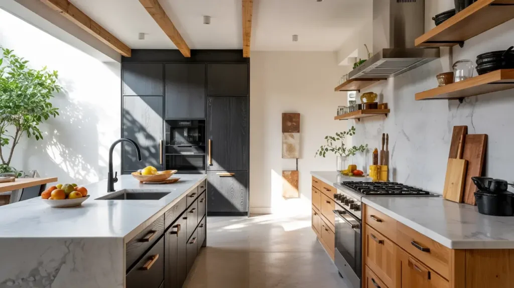 10. Two‑Tone Black and Wood Kitchen with Marble Countertops