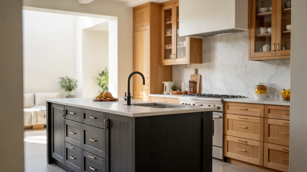 Want a showstopper? Keep your main cabinets in light oak (think creamy, natural wood) but go bold with a black kitchen island. It creates a stunning focal point without overwhelming the room. Plus, the island becomes your prep station, dining spot, and Instagram‑worthy centerpiece — all in one!