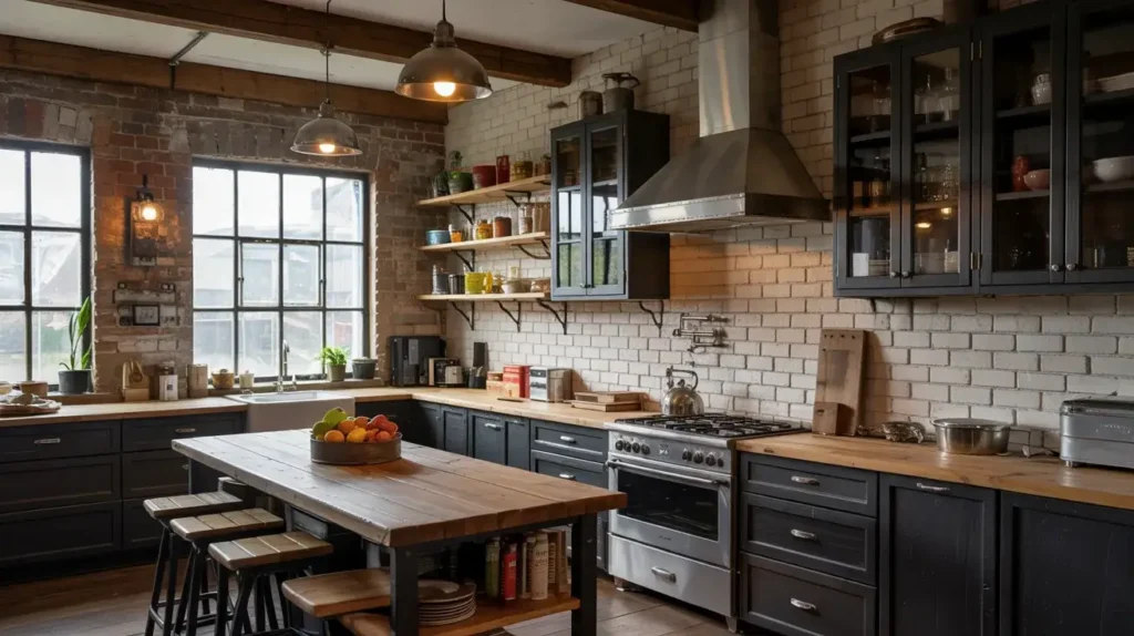 I saw this combo in a loft downtown. The black cabinets had metal handles, and the island top was reclaimed barn wood — full of knots and character. It looked like it came straight out of a Brooklyn artisan’s dream.