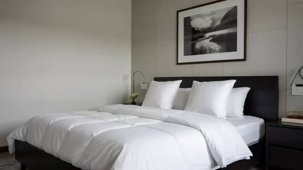 Keep your color palette tight. Black, white, and maybe one accent color (gray works great, or a muted sage green). Your bedding should be simple and unfussy—solid colors, smooth textures, nothing with ruffles or excessive patterns.
