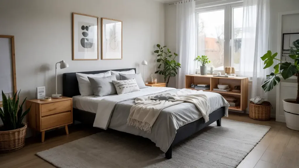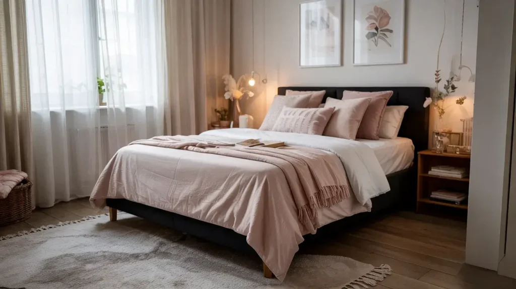 Keep the frame style simple—ornate headboards or posts can make small spaces feel cluttered. A streamlined platform bed or simple metal frame works perfectly, providing structure without visual weight.