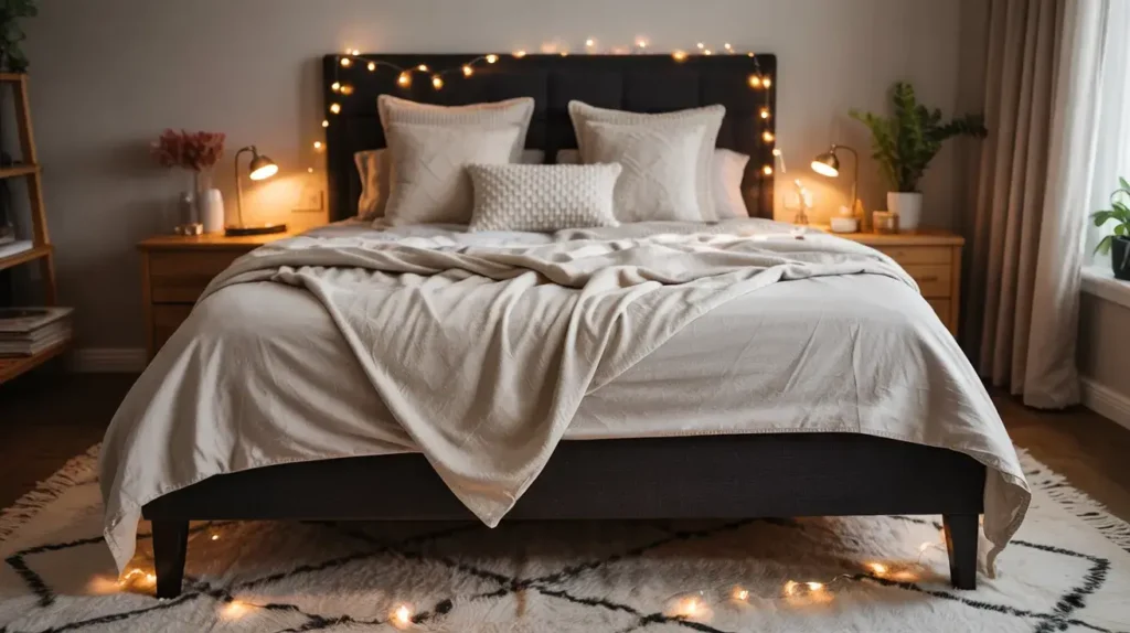 Rugs add both visual and actual warmth. A plush area rug under and extending beyond your black bed frame defines your sleeping zone and feels amazing on bare feet. Layering rugs—a jute rug with a smaller sheepskin or vintage rug on top—adds dimension and that coveted “cozy” factor.