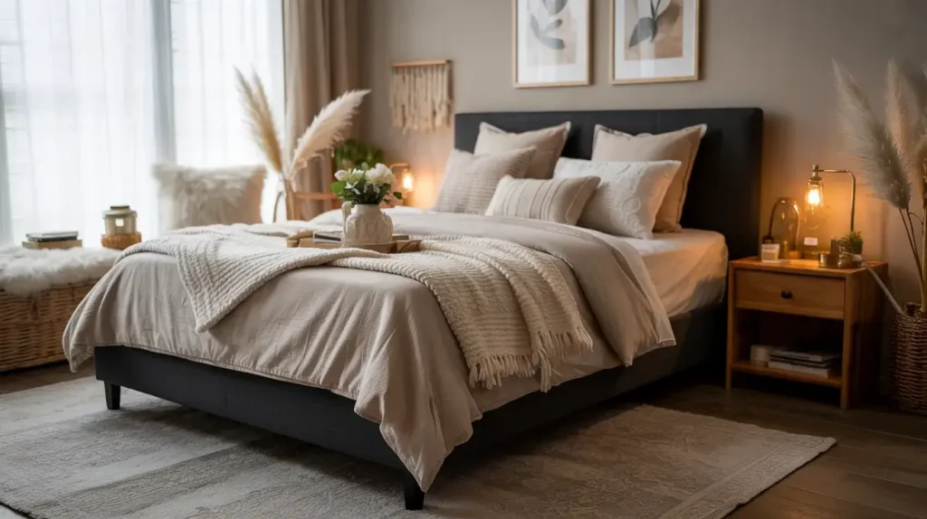 1. Cozy Black Bed Frame with Warm Neutrals