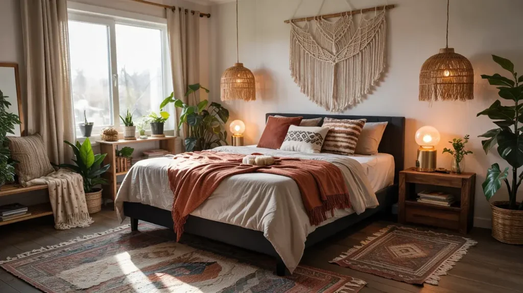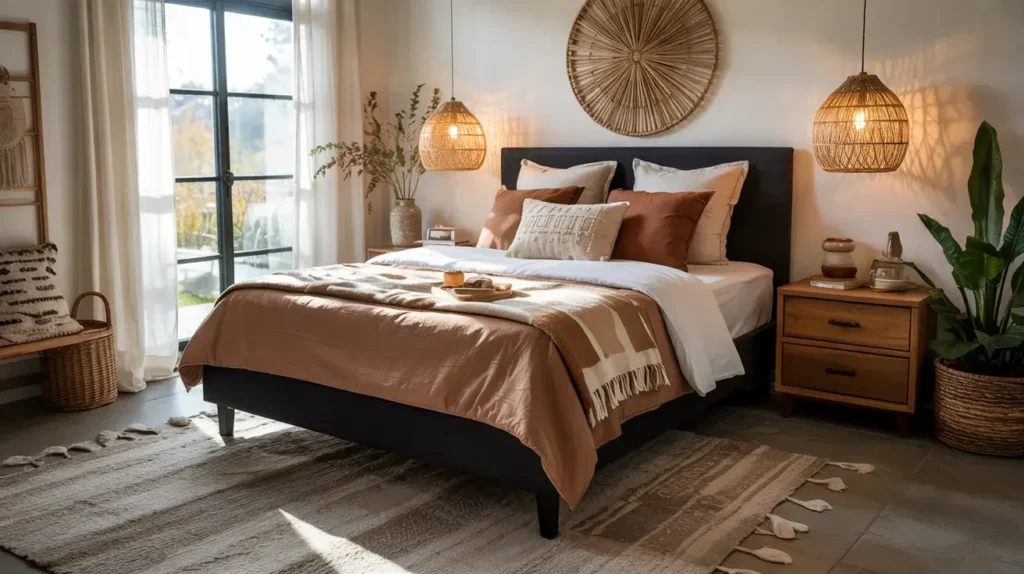 Natural materials are essential to authentic boho vibes. Rattan nightstands, woven baskets, wood beads, macramé, jute rugs—these organic textures bring warmth and earthiness. Against your sleek black frame, they create beautiful contrast between refined and relaxed.