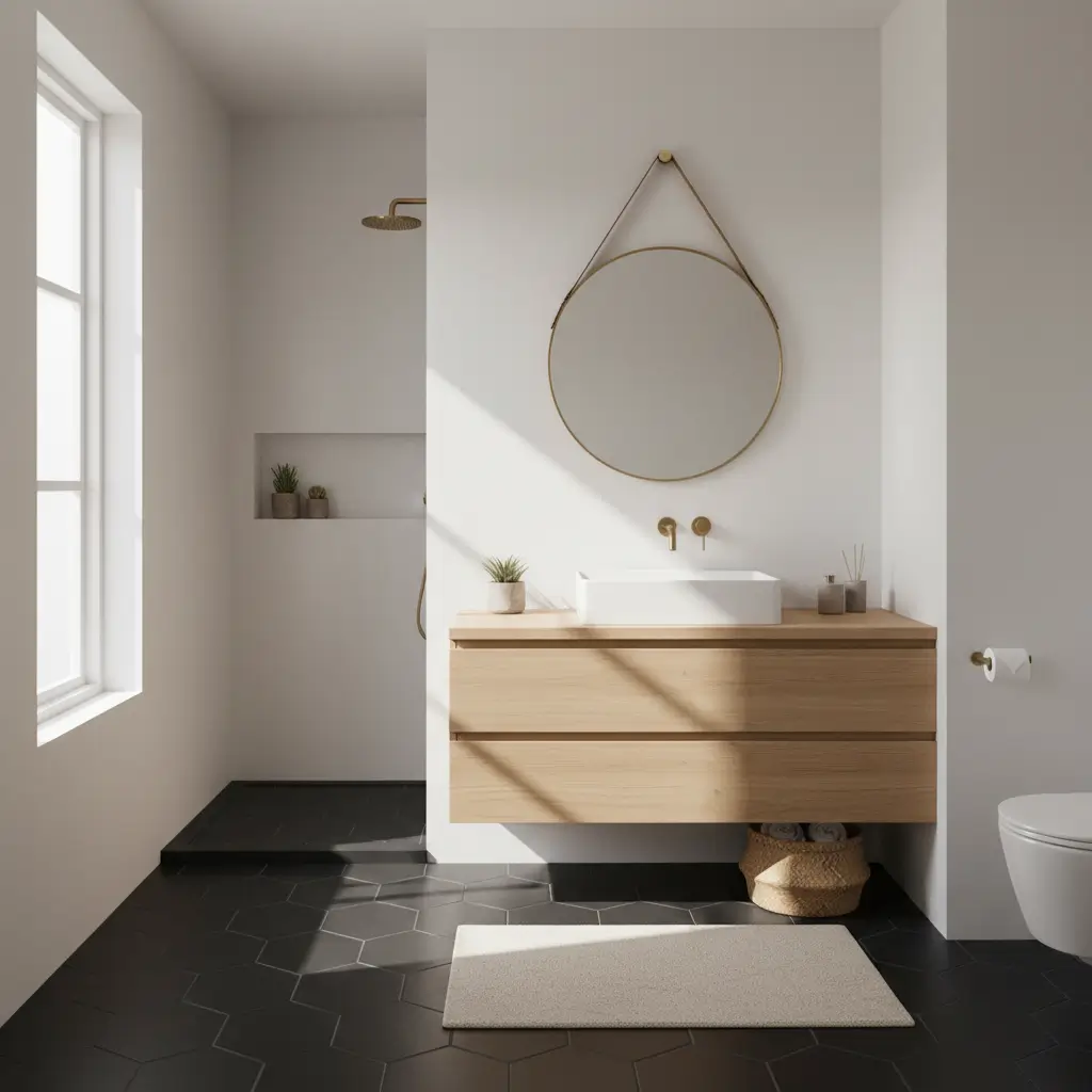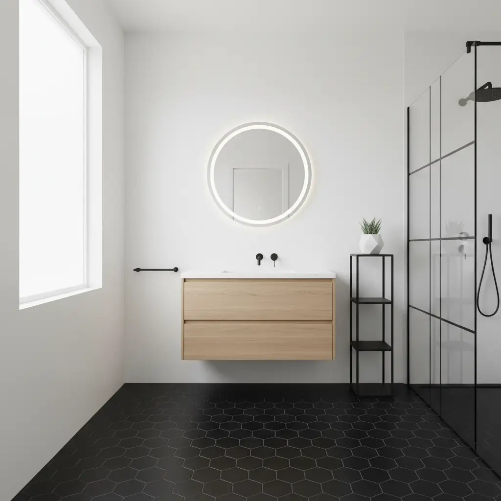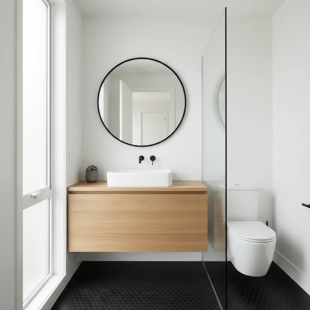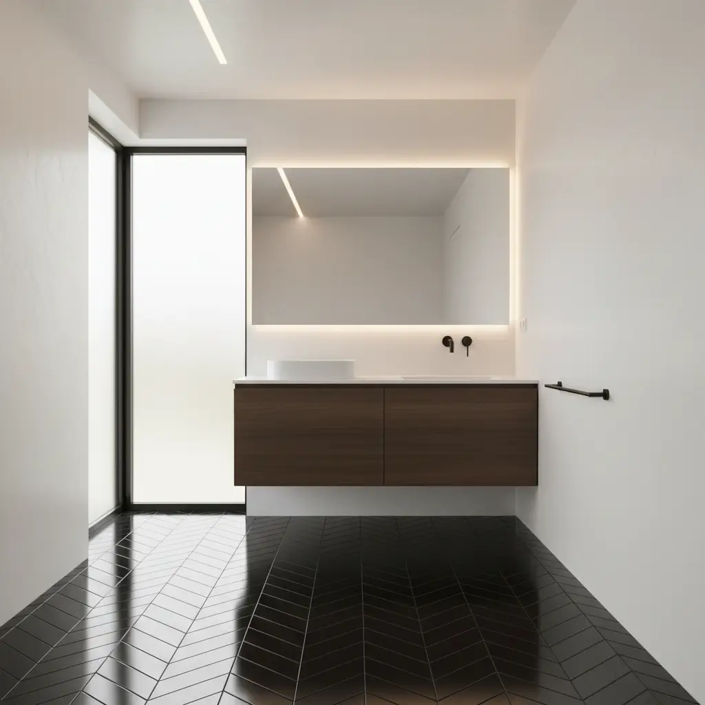 The secret weapon here is the floating wood vanity. By mounting your vanity on the wall instead of letting it sit on the floor, you expose more of that beautiful black flooring, which tricks the eye into perceiving more space. Plus, the warmth of natural wood creates a stunning contrast that prevents the black from feeling heavy or oppressive.