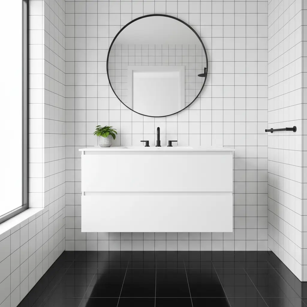 The contrast here is everything. Your black floor grounds the entire space while those crisp white tiles climb the walls, creating this gorgeous visual tension that somehow feels both energizing and calming. I installed this exact combo in my guest bathroom last year, and the number of compliments I’ve gotten is borderline ridiculous.