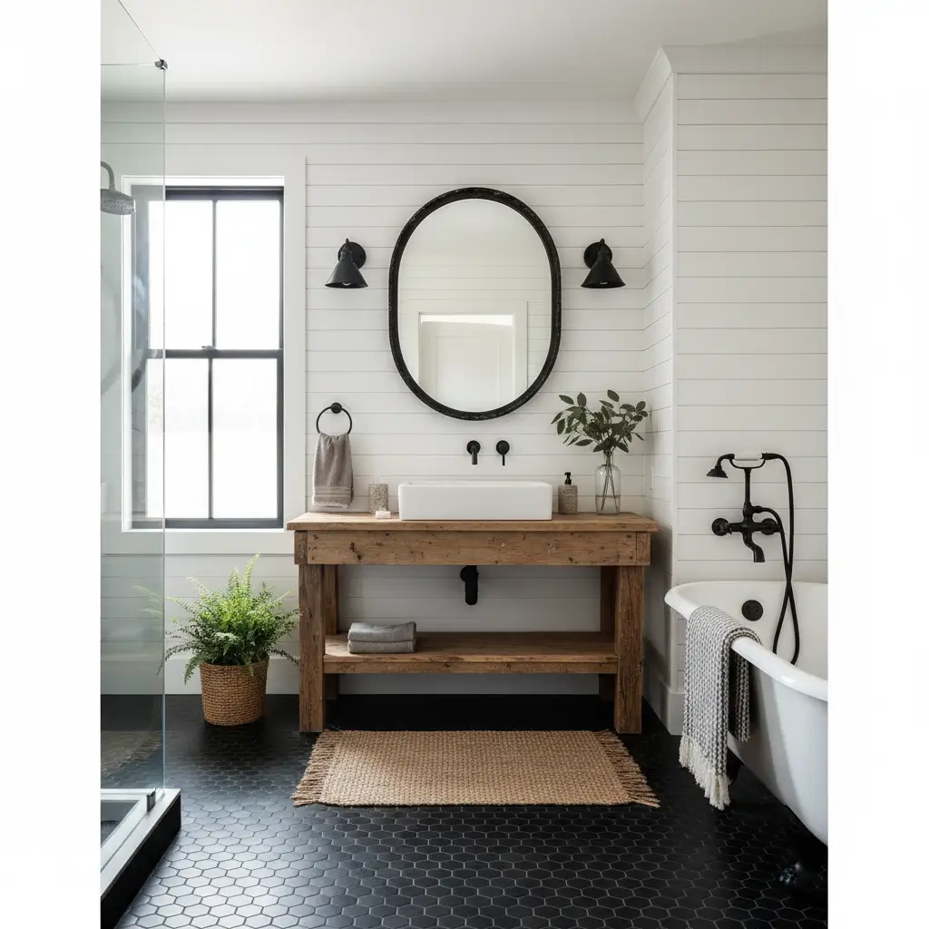 The key to preventing this from looking like a Cracker Barrel exploded in your bathroom is restraint and quality. Choose authentic materials when possible, limit the roosters and “wash your hands” signs (please, I’m begging you), and let the black floor provide that modern contrast that keeps things fresh. One well-chosen antique piece beats seventeen mass-produced “farmhouse” accessories every single time.
