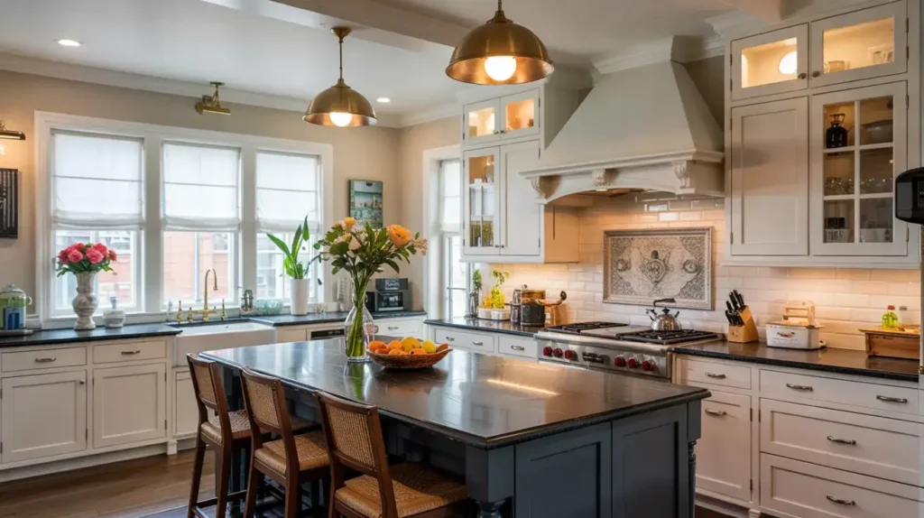 13. Coastal Style Kitchen with Black Granite Contrast