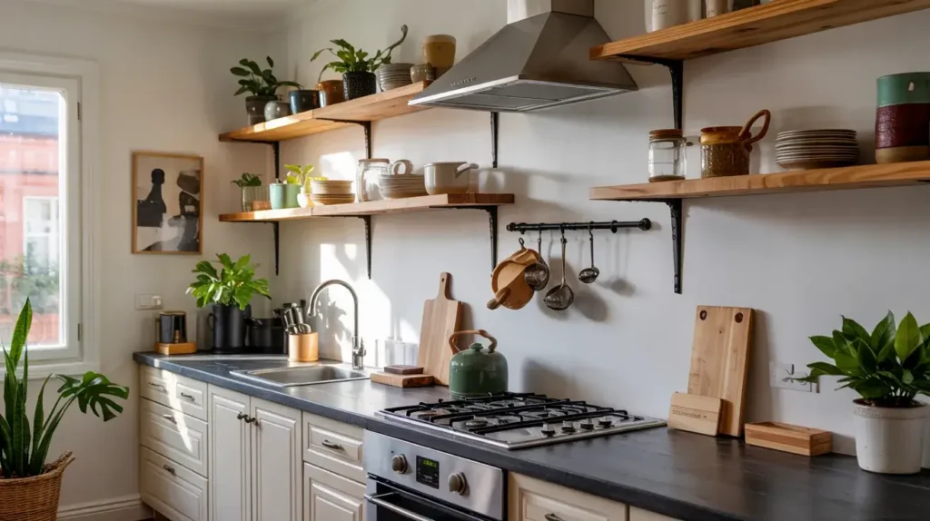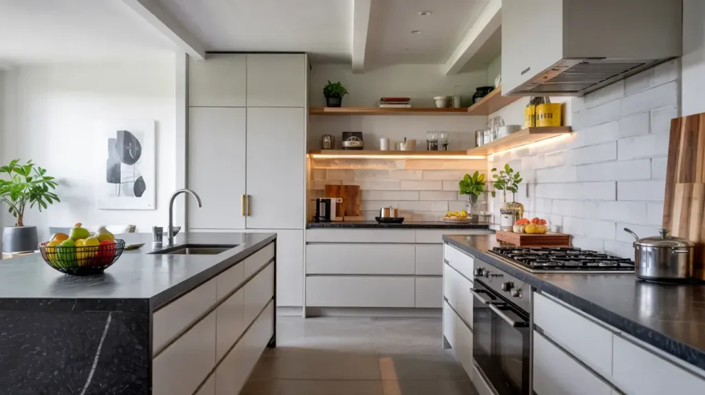 12. Open Shelving Kitchen with Statement Black Granite