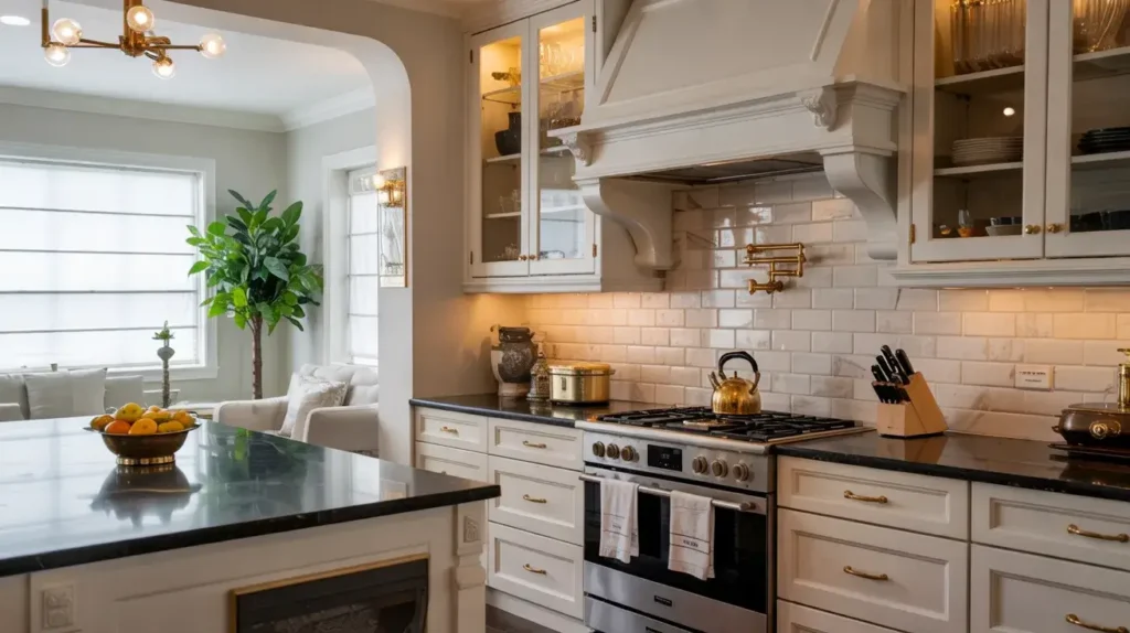 10. Bright Kitchen with Gold Accents and Black Granite