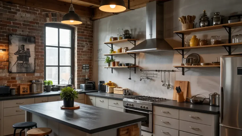 Pair black granite counters with raw concrete walls, open metal shelves, and a beat up stainless steel range. Suddenly it doesn’t feel like a set from a food blogger’s Instagram. It feels cool. It feels lived in. It feels like you.