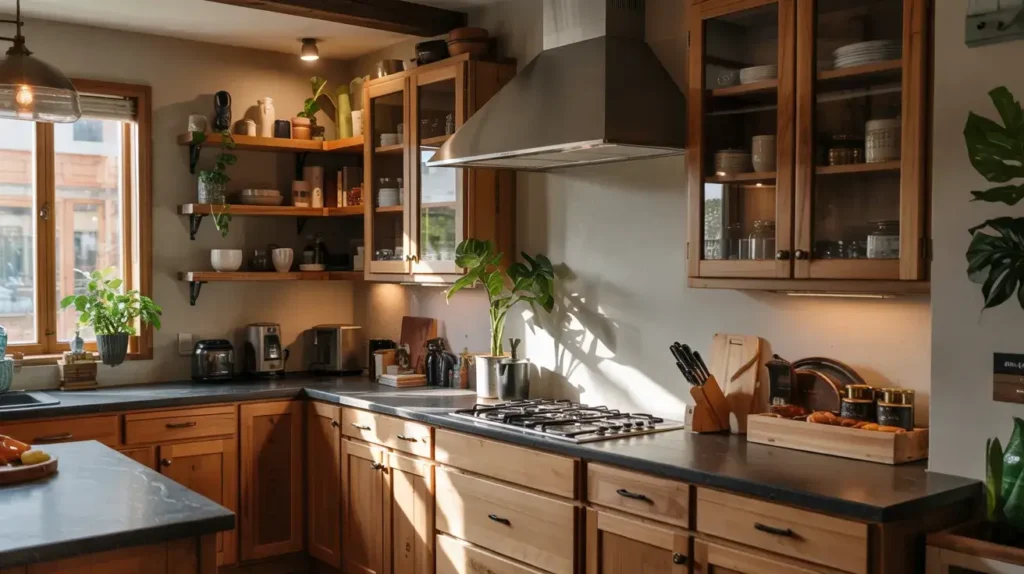 2. Warm Wood Kitchen with Matte Black Granite Surfaces