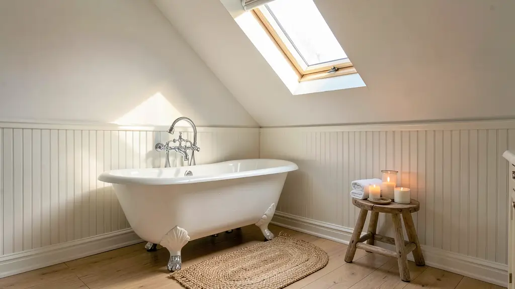 Position your clawfoot tub under a skylight or dormer window, and suddenly you’re bathing under the stars (or clouds, depending on the weather). The sloped ceilings that make furniture placement tricky elsewhere? Perfect height for a low-profile tub. Those exposed beams that might feel rustic in other spaces? Absolutely beautiful in a bathroom setting.